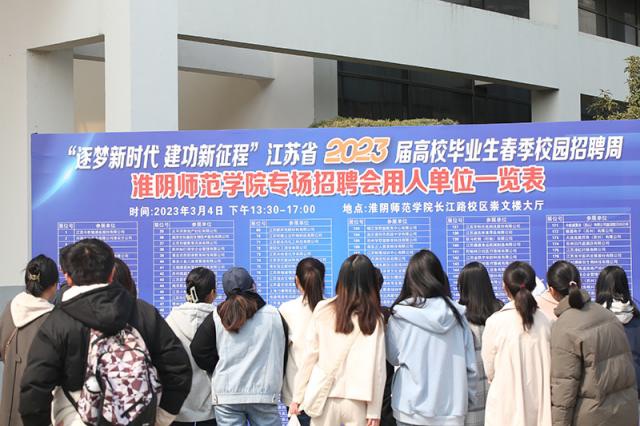3月4日,“逐夢(mèng)新時(shí)代 建功新征程”江蘇省2023屆高校畢業(yè)生春季校園招聘周淮陰師范學(xué)院專(zhuān)場(chǎng)招聘活動(dòng)在長(zhǎng)江路校區(qū)崇文樓大廳舉行。220余家企業(yè)及近4000余名畢業(yè)生參加活動(dòng)。